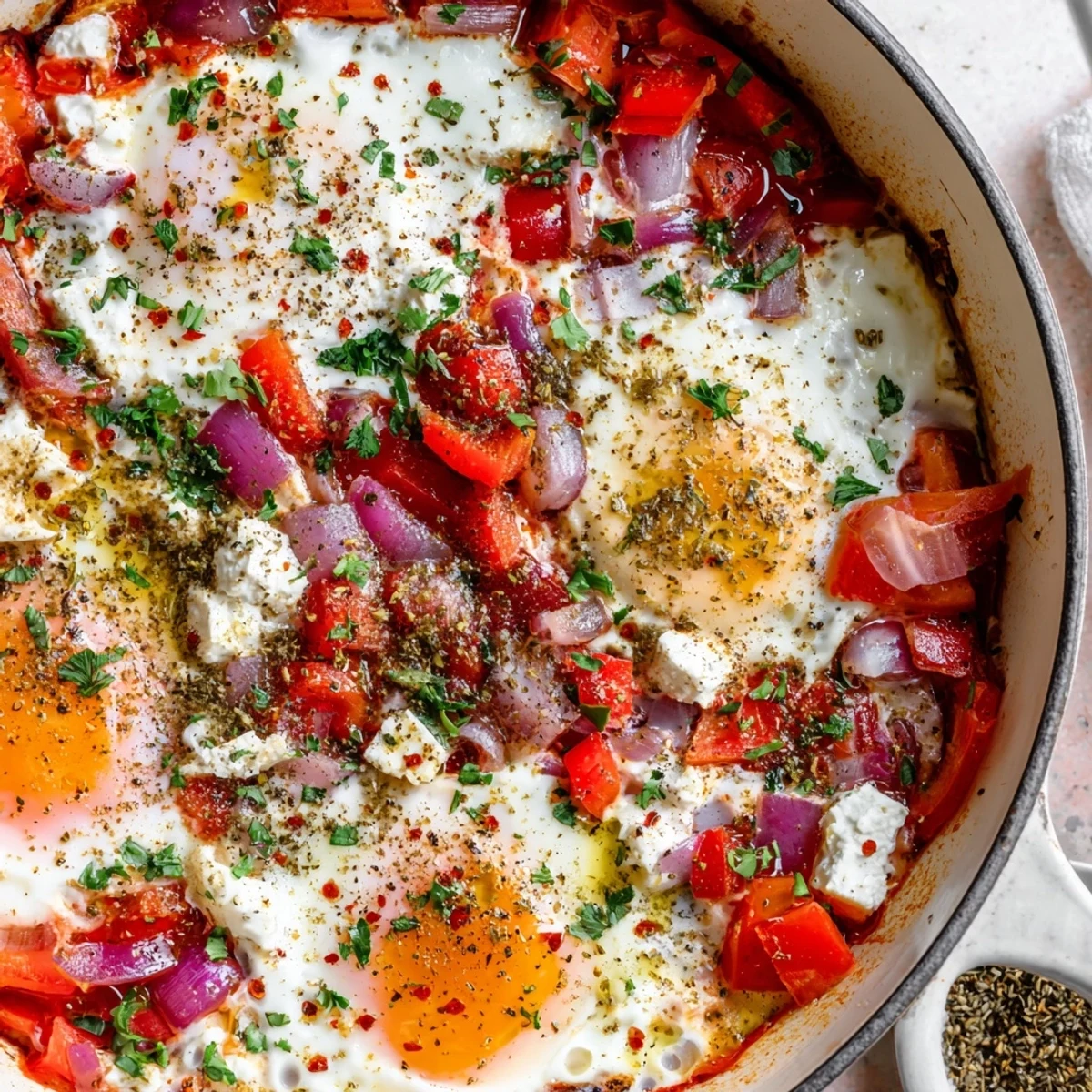 This Mediterranean-inspired dish combines tangy feta cheese with perfectly baked eggs, creating a creamy, protein-rich breakfast. The vegetables—tomatoes, bell peppers, onions, and garlic—caramelize in the oven, releasing their natural sweetness. Fresh parsley and aromatic oregano add brightness, while a hint of red pepper flakes brings gentle warmth. Perfect for busy mornings, this dish comes together in under 30 minutes and serves two generously. The feta melts slightly, creating pockets of creaminess throughout. Pair with crusty bread to soak up the flavorful juices.