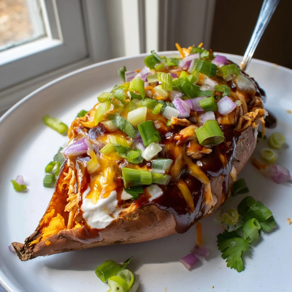 These loaded sweet potatoes combine the natural sweetness of roasted tubers with savory, smoky BBQ chicken and gooey melted cheddar. The dish comes together effortlessly—roast the potatoes until fork-tender, meanwhile warm shredded chicken in your favorite barbecue sauce. Split open each potato, fluff the flesh, pile on the sauced chicken, and finish with cheese that melts into every crevice. Top with fresh green onions, a dollop of sour cream, and herbs for a complete meal that hits all the right notes—sweet, smoky, tangy, and creamy.