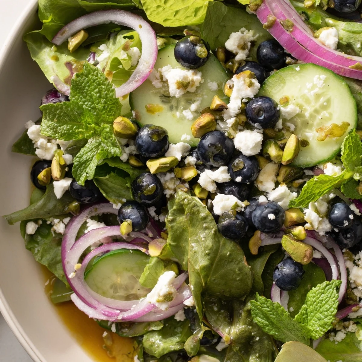 This vibrant salad brings together the perfect balance of sweet and savory flavors. Fresh blueberries provide natural sweetness while crunchy pistachios add texture and nuttiness. The spring mix base offers tender, mild greens that pair beautifully with the tangy feta cheese.