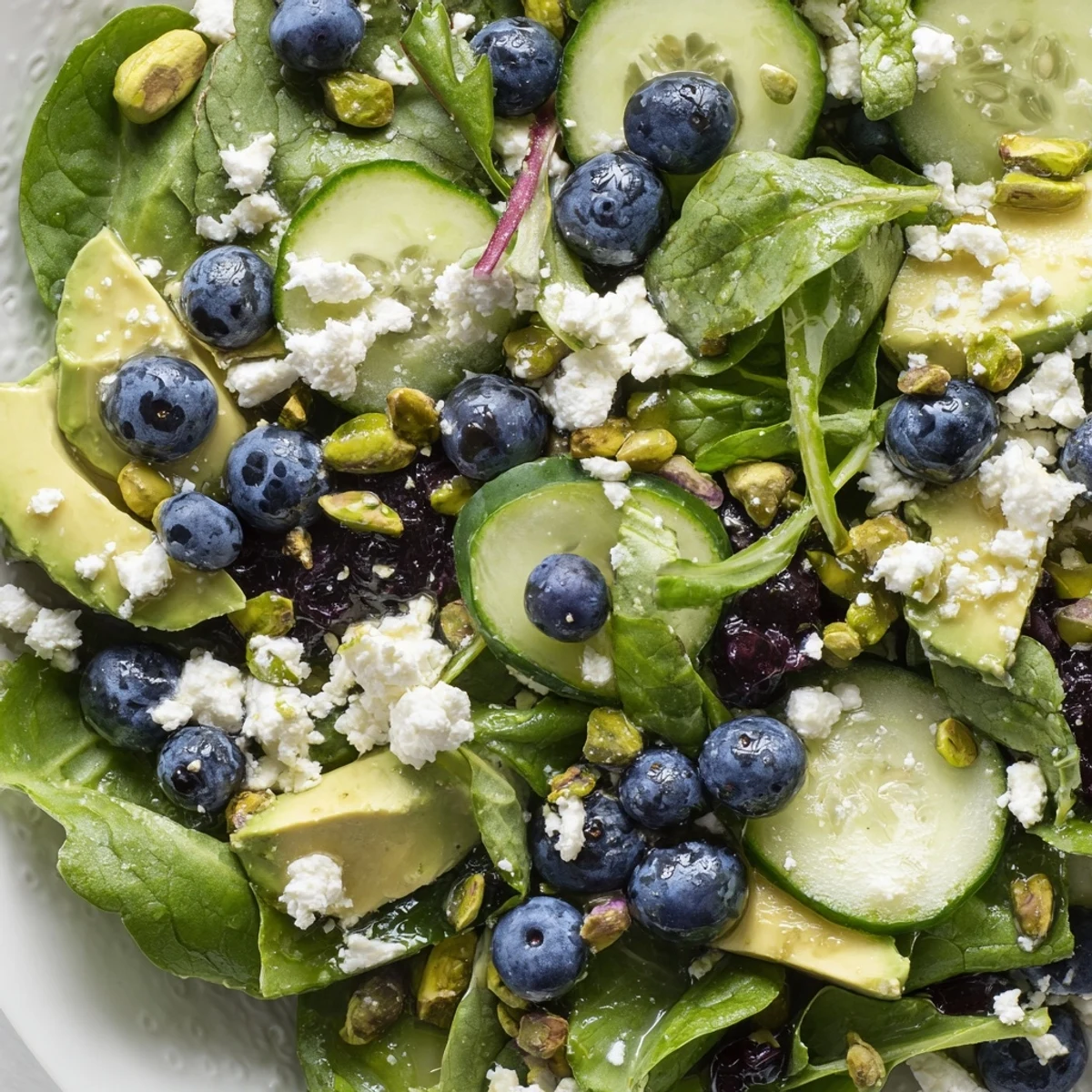 This refreshing salad combines juicy fresh blueberries with crunchy pistachios, tender spring greens, crisp cucumber, creamy avocado, and tangy feta cheese. A simple whisked dressing of olive oil, lemon juice, honey, and Dijon mustard ties everything together with bright acidity. Ready in just 15 minutes with no cooking required, this vibrant dish is ideal for light lunches, spring gatherings, or as a colorful side. The combination of sweet fruit, savory cheese, and nuts creates perfect balance.