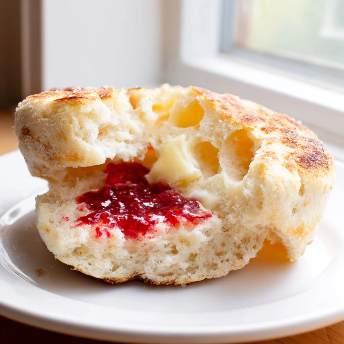 This was a game changer for me. Instead of cutting with a knife which creates smooth sides use a fork to pierce around the edges and pull the halves apart. This reveals all those beautiful crags and crevices that English muffins are famous for. The rough surface holds onto melted butter and jam in ways a knife cut slice never could. It takes a bit of practice but the texture difference is absolutely worth it.