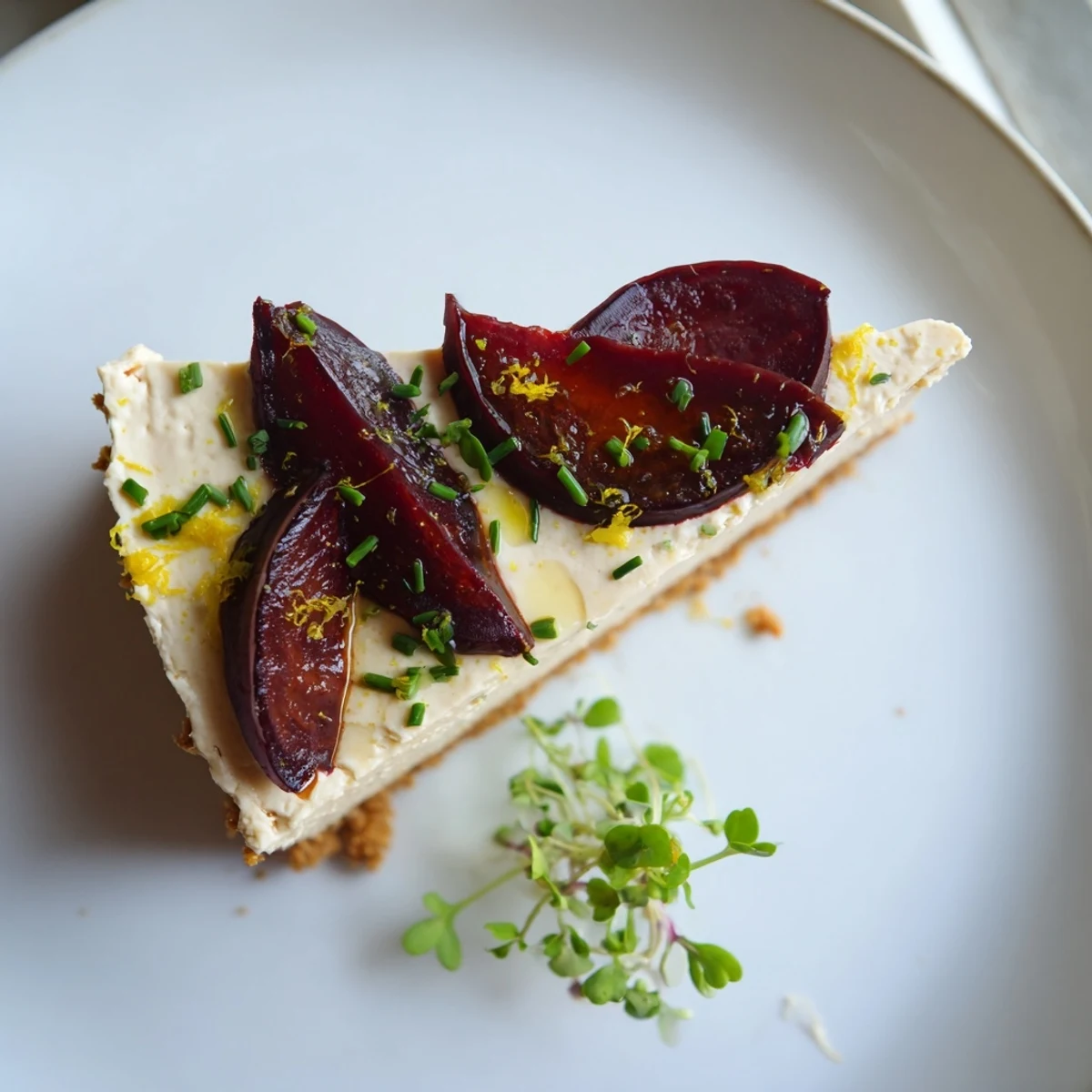 - Release the cheesecake from the pan and arrange those gorgeous roasted beets on top. Scatter fresh chives and microgreens over everything, then finish with a generous drizzle of your best olive oil. Serve chilled or at room temperature and watch people fall in love.