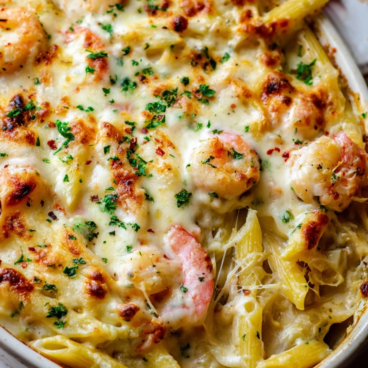 This oven-baked dish combines plump shrimp with al dente penne in a rich, lemony garlic-butter cream sauce. The white wine adds depth while red pepper flakes provide gentle warmth. After tossing everything together, it gets crowned with mozzarella and parmesan, then baked until golden and bubbling. The result is a comforting casserole with tender seafood, perfectly coated pasta, and a crispy, cheesy topping that's ready in under an hour.
