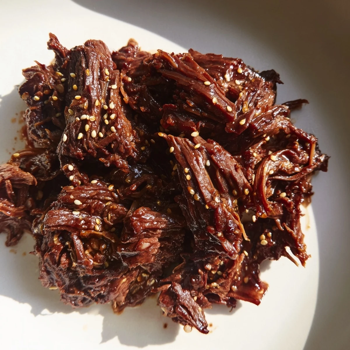 - Use two forks to shred the beef right in the cooker, mixing it with all that sauce. Top with fresh green onions and extra sesame seeds, then serve over steaming rice or spoon into lettuce cups for a lighter option.